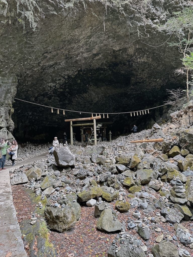 步道的末端就是一個巨大壯觀的山洞,地上隨處可見都是信徒們疊起來的許願小石堆,往內走還有一個小神社,想到把神社放在這邊的日本人真的也是令人嘆為觀止!