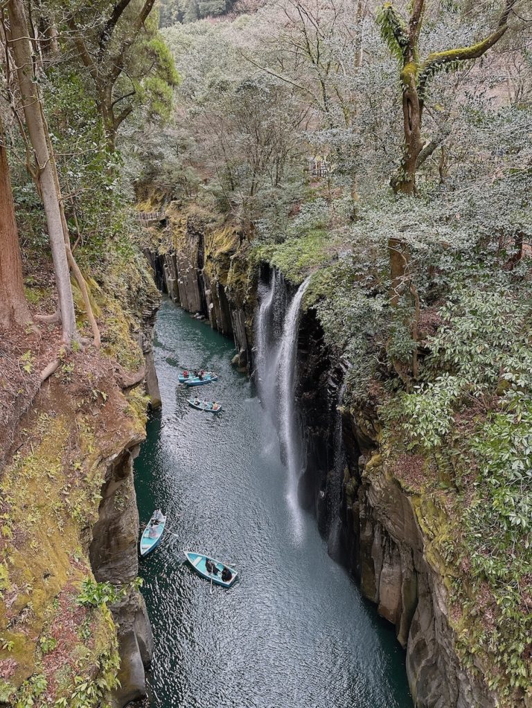 走到靠近名物產販賣店旁的小橋,就是最佳拍照景點,當天天氣冷我們就沒下去划船,如果天氣不錯,建議可以提前至官網預約小船(https://takachiho-kanko.info/boat/detail.php),從另一個角度欣賞高千穗峽的美!